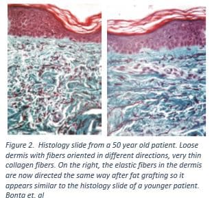 The aging process and this fat grafting intervention demonstrate the concept of structure and function. During aging there is a disorganization of the structures below the superficial dermis creating a new landscape for the skin. As the face hollows and the tone of the skin decreases, the features of the face become more angular and wrinkles form. In order to rejuvenate the face, a plastic surgeon fills in the spaces that have become hollow. The introduction of fat or stem cells directs the disorganized and hollow extracellular matrix to realign increase in density and regain previous functions8. In doing so the texture and the elasticity of the skin are improved and the face looks younger and revived.