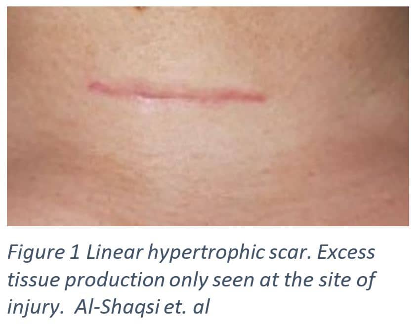 Under normal conditions the fibroblasts will disappear once the wound is closed and new cells have replaced the scar tissue. Sometimes the fibroblasts, will stay at the wound site and continue making connective tissue, creating a thick region of scar tissue as seen in Figure 1 [1]. This thick area of tissue is inconsistent with the skin in the surrounding area creating a difference in topography and a tightened or distorted skin surrounding the scar [3, 7]. The myofibroblasts with their contractile proteins trying to close the wound are not replaced with new skin cells creating a tightened appearance around the healed wound.