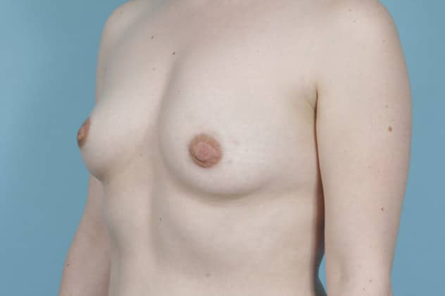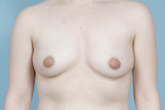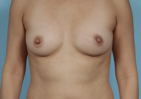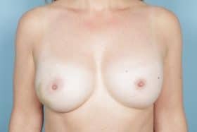 Bilateral nipple sparing mastectomies followed by 2-stage expander/implant submuscular breast reconstruction, 335 cc full profile smooth round silicone gel implants, 18 months post op