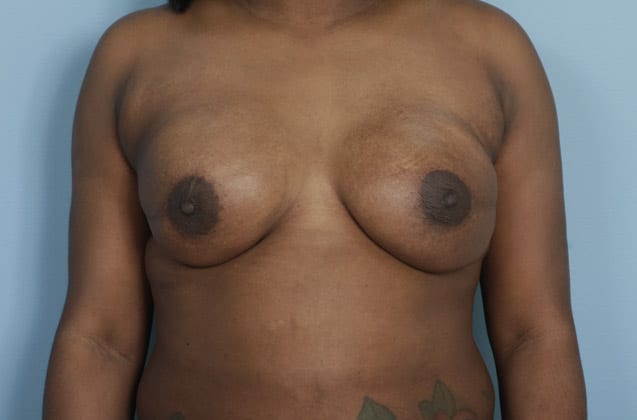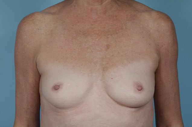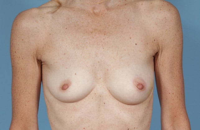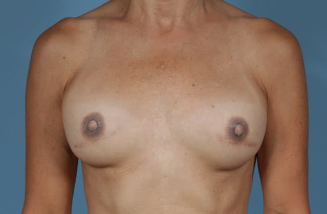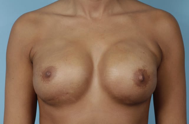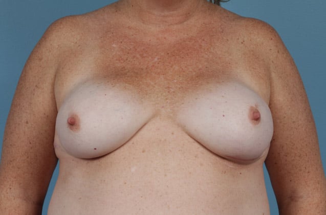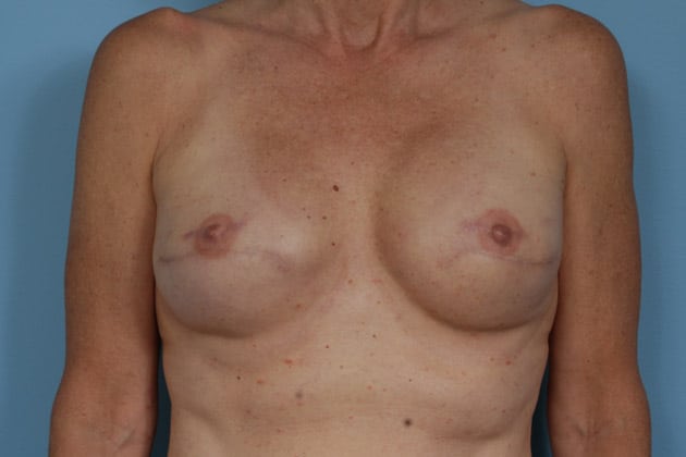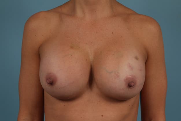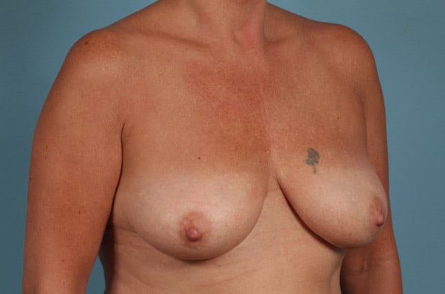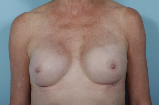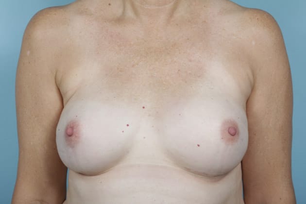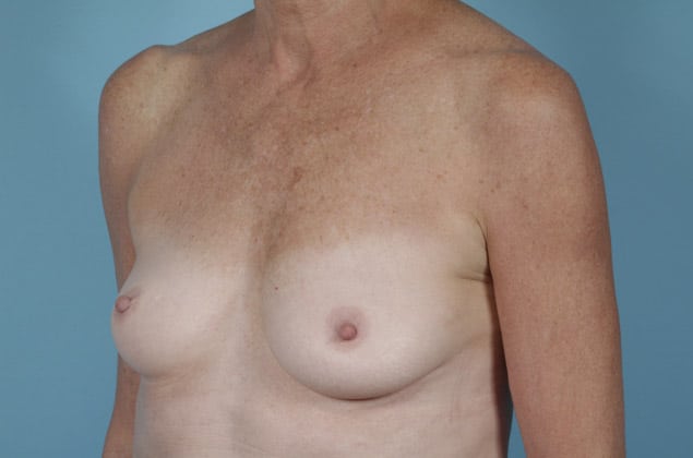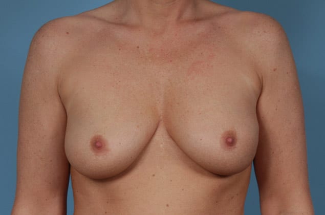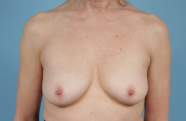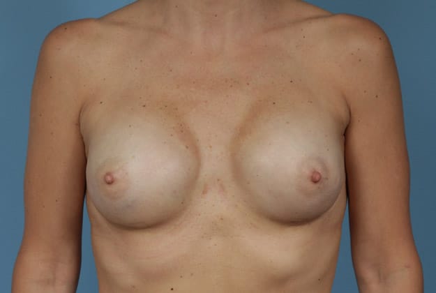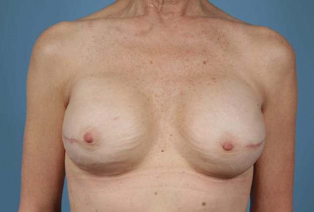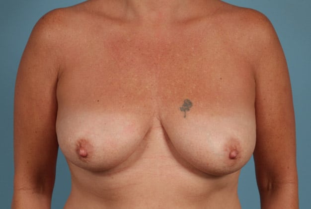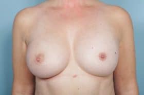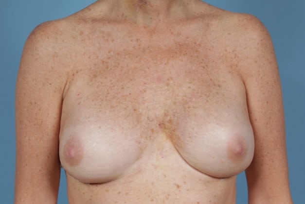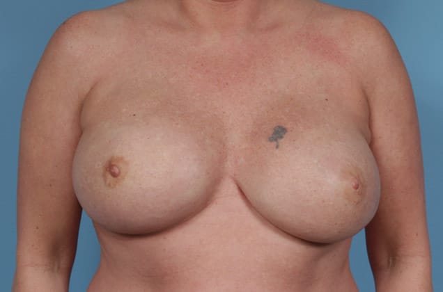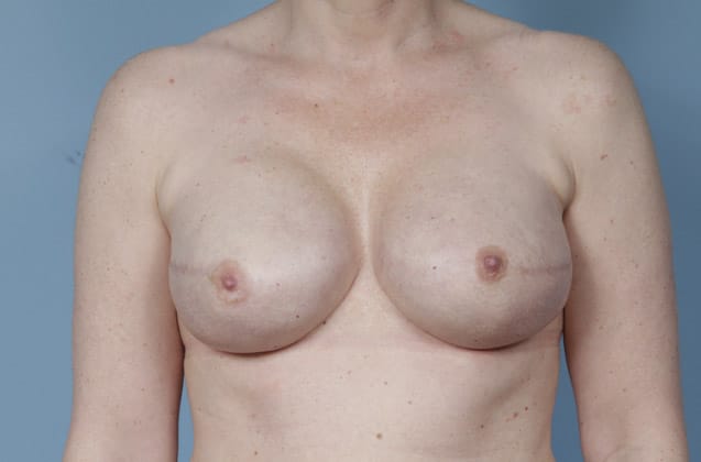 Bilateral skin sparing mastectomies followed by 2-stage expander/implant submuscular breast reconstruction, 425 cc textured shaped silicone gel implants, 4 years post op