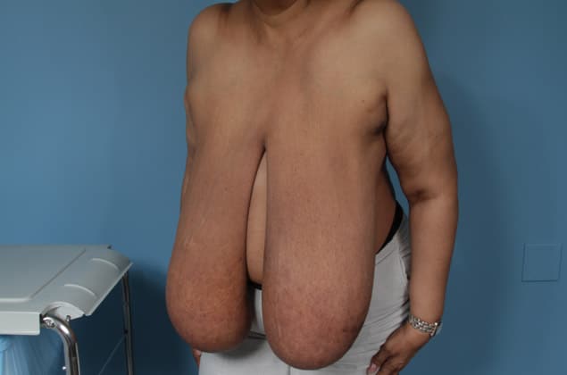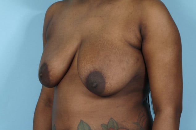 Left skin sparing mastectomy followed by 2-stage expander/implant prepectoral breast reconstruction, right breast reduction for symmetry, 775 cc textured shaped silicone gel implant on the left, 10 months post op