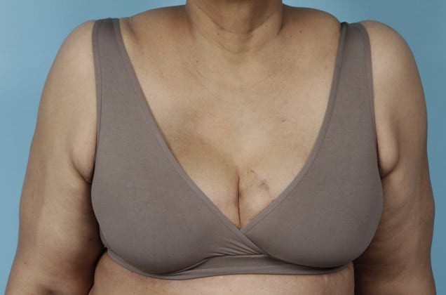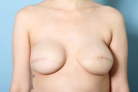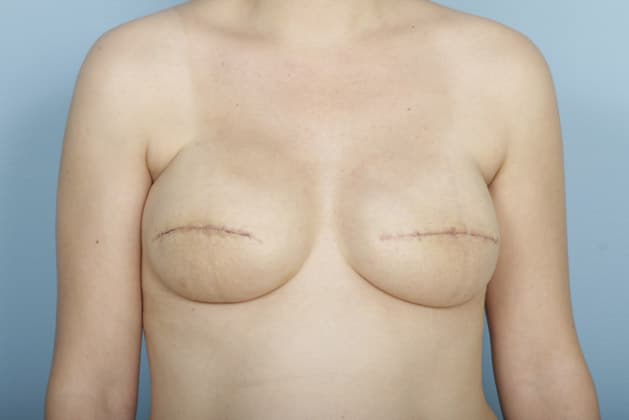 Bilateral skin-sparing mastectomies followed by 2-stage expander/implant submuscular breast reconstruction, 520 cc full profile smooth round silicone gel implants, 5 months post op