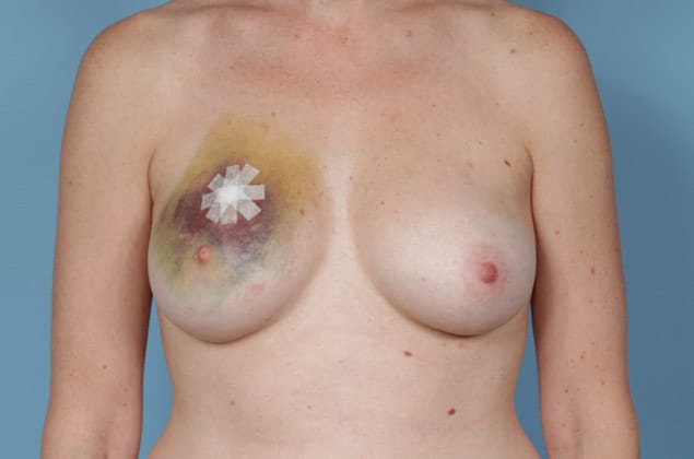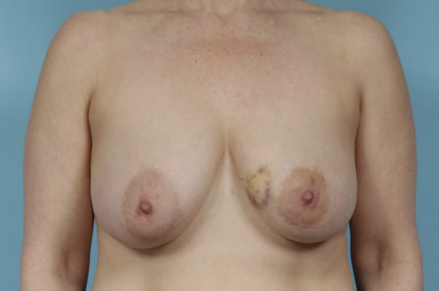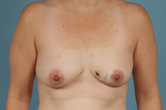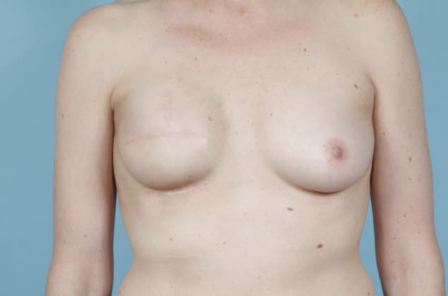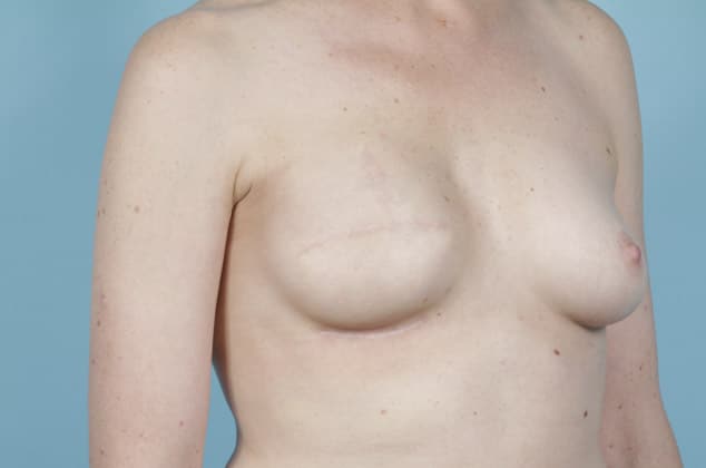 Left lumpectomy with direct-to-implant submuscular breast reconstruction and implant placement on the right, 500 cc high profile smooth round silicone gel implants, 1 month post op
