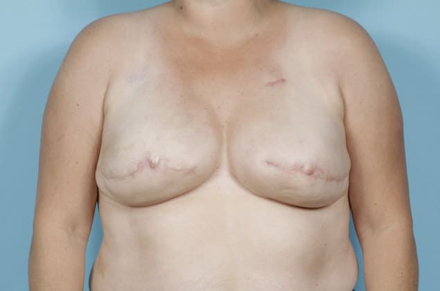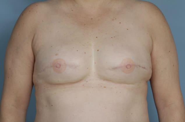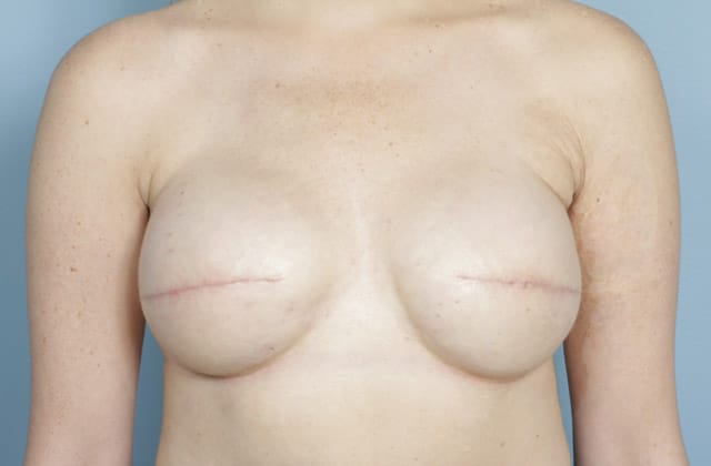 Bilateral skin sparing mastectomies followed by 2-stage expander/implant submuscular breast reconstruction, a 640 cc moderate profile smooth round silicone gel implant on the left and a 650 cc full profile smooth round silicone gel implant on the right, 10 months post op