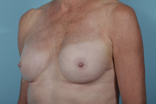 Right nipple sparing mastectomy followed by 2-stage expander/implant submuscular breast reconstruction, 445 cc moderate profile smooth round silicone gel implant on the right, 3 months post op