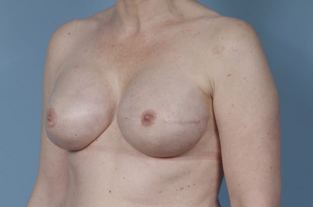 Right skin sparing mastectomy followed by 2-stage expander/implant submuscular breast reconstruction, left breast mastopexy for symmetry, 345 cc full profile smooth round silicone gel implant on the right, 4 months post op