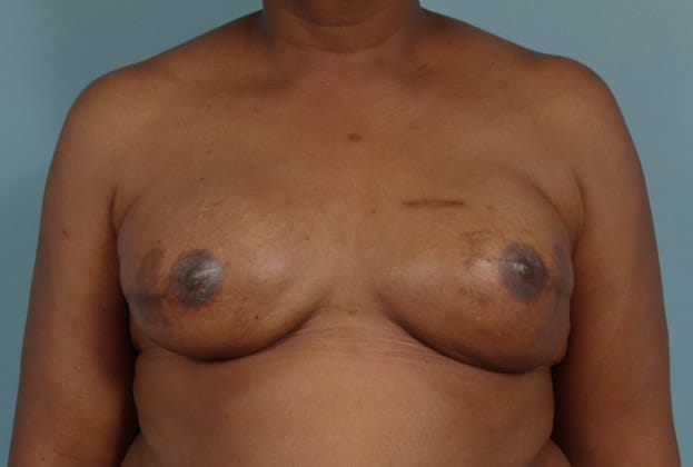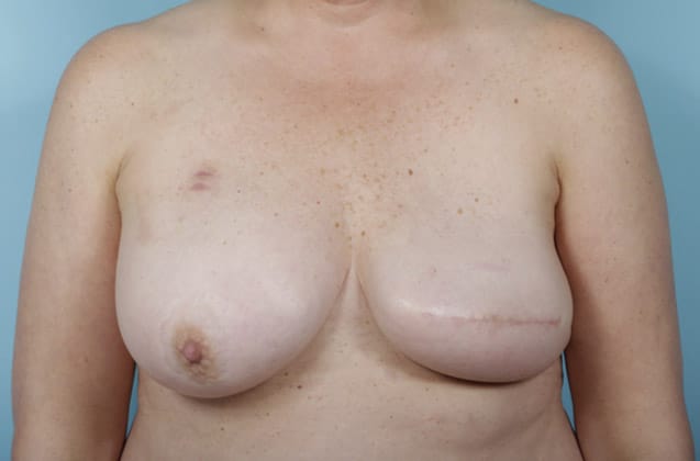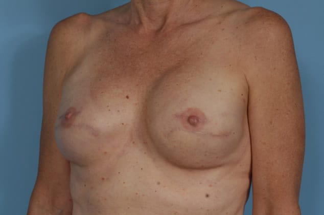 Right nipple sparing mastectomy followed by 2-stage expander/implant submuscular breast reconstruction, left breast augmentation for symmetry, 270 cc silicone gel implant on the right and 160 cc low profile silicone gel implant on the left, 5 months post op