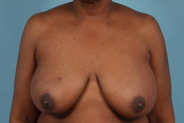 Right skin sparing mastectomy followed by 2-stage expander/implant submuscular breast reconstruction, left breast reduction for symmetry, 800 cc moderate plus profile silicone gel implant, 18 months post op