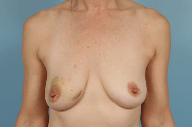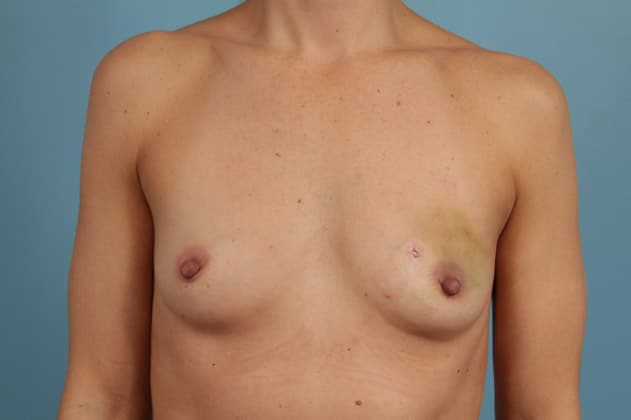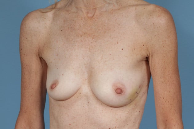 Right nipple sparing mastectomy followed by 2-stage expander/implant submuscular breast reconstruction, left breast augmentation for symmetry, 450 cc textured shaped silicone gel implant on the right and 175 cc moderate height silicone gel implant on the left, 1 week post op